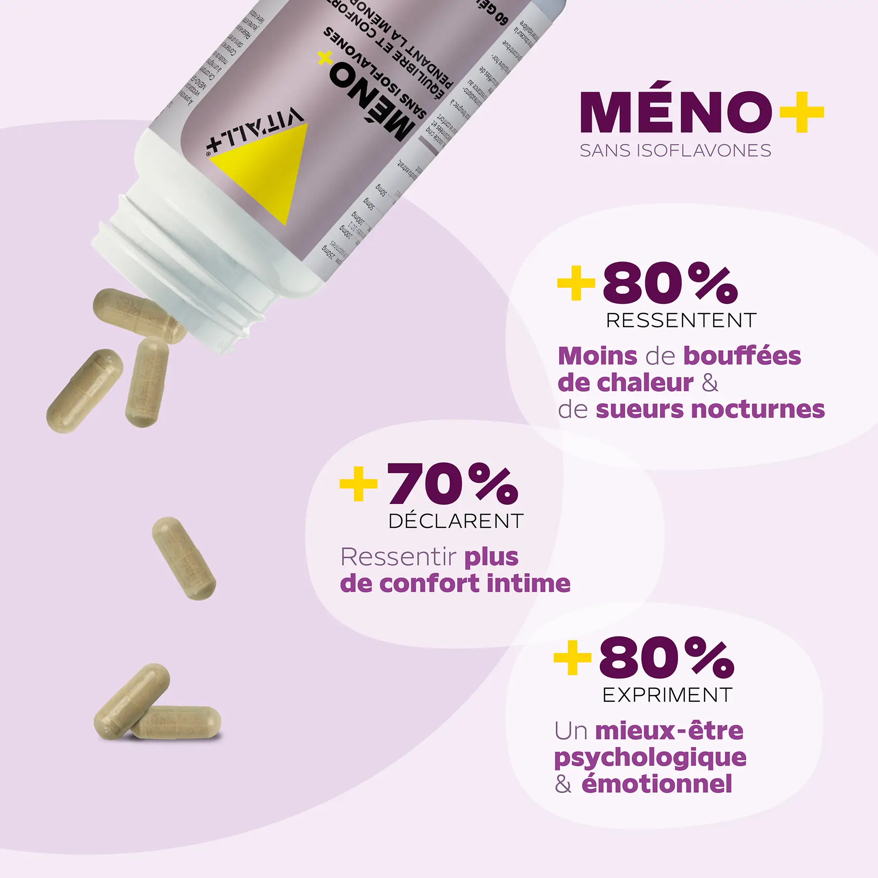 *Étude consommateur réalisée en France d’octobre 2025 à janvier 2026 (3 mois) par un institut d’étude indépendant (Mérieux Nutrisciences) sur un panel de 90 femmes (formule MENO+ – 1 gélule/j) et 89 femmes (formule MENO+ sans isoflavones – 2 gélules/j) en période de péri-ménopause (25%) et de ménopause (75%).