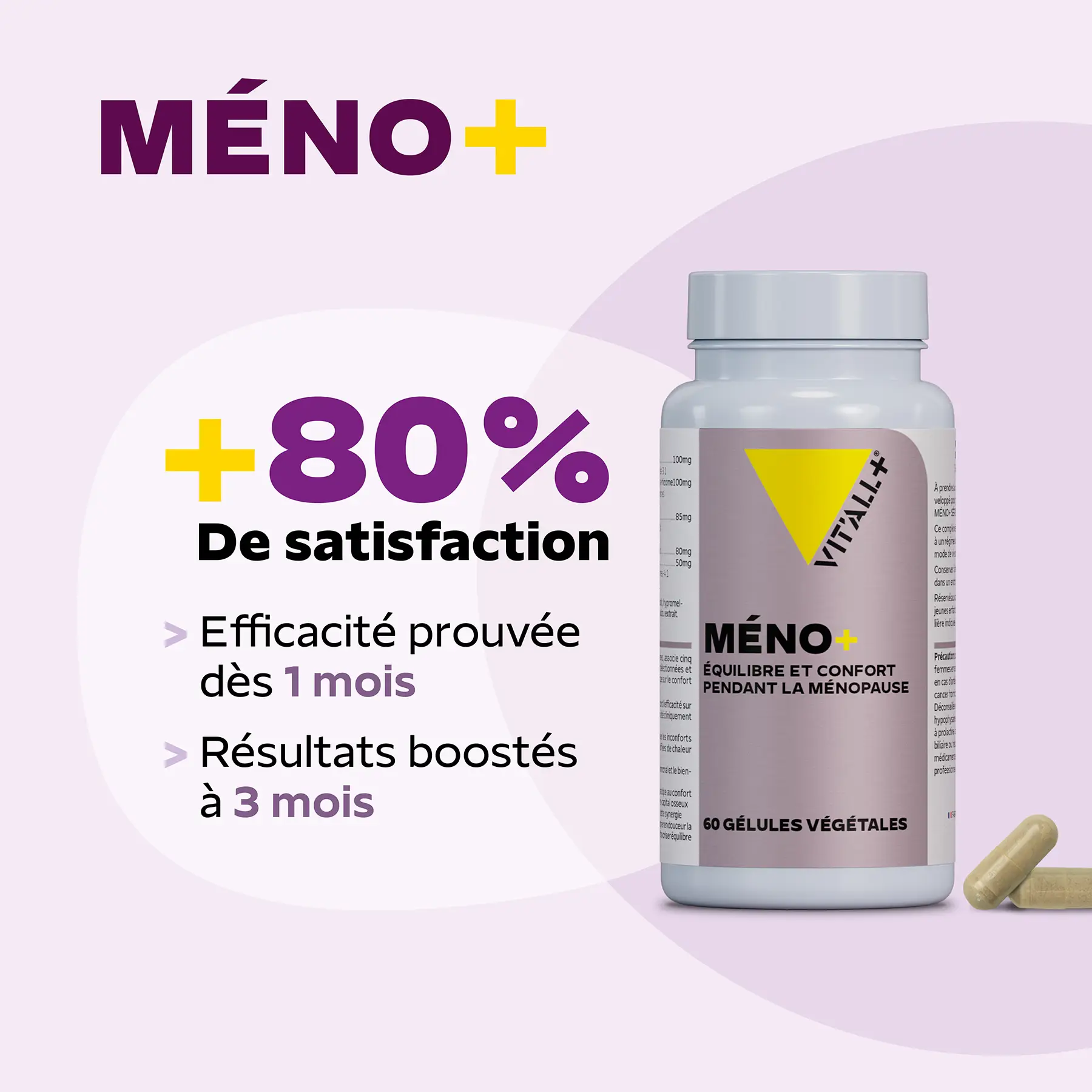 *Étude consommateur réalisée en France d’octobre 2025 à janvier 2026 (3 mois) par un institut d’étude indépendant (Mérieux Nutrisciences) sur un panel de 90 femmes (formule MENO+ – 1 gélule/j) et 89 femmes (formule MENO+ sans isoflavones – 2 gélules/j) en période de péri-ménopause (25%) et de ménopause (75%).