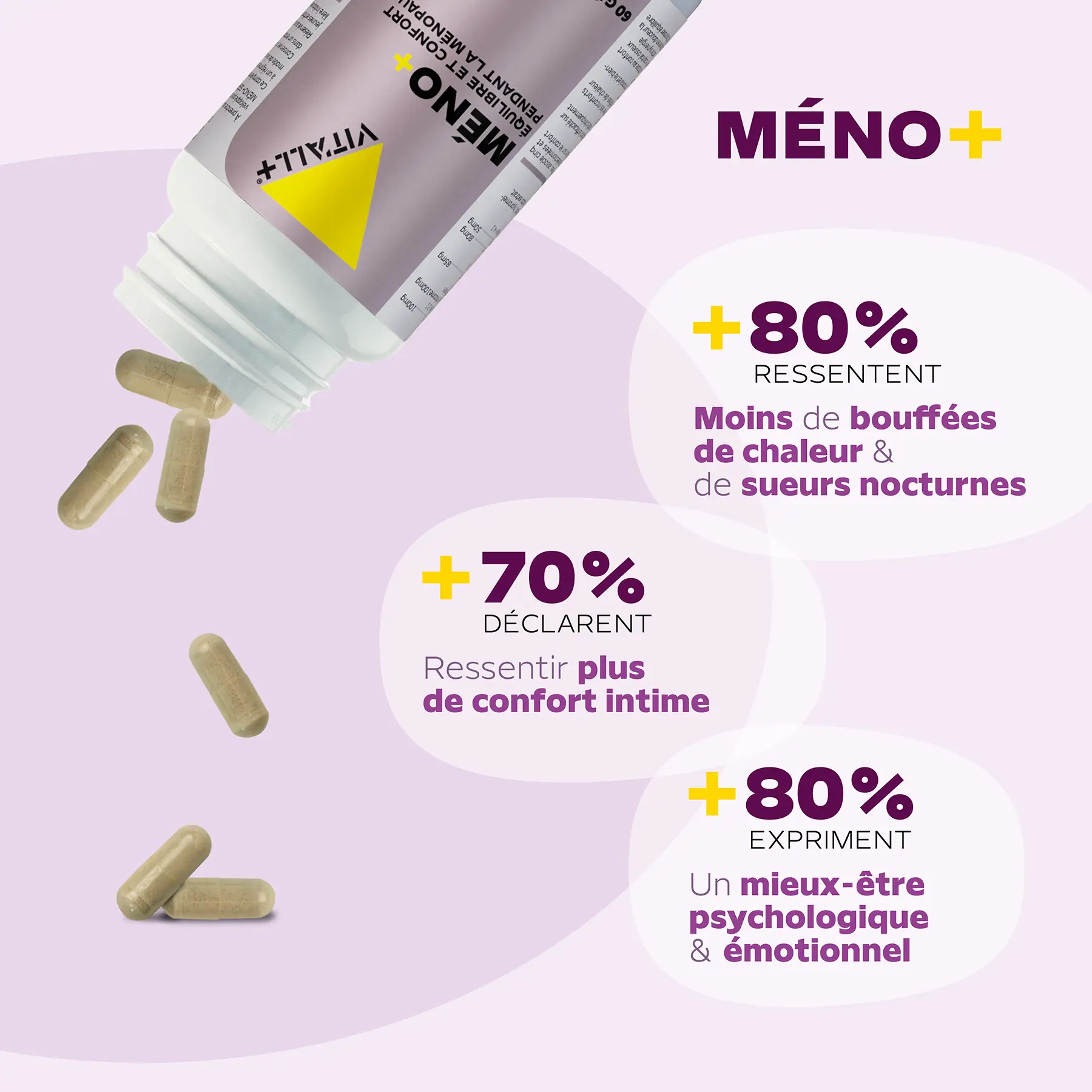 *Efficacité prouvée dès 1 mois, résultats boostés à 3 mois : +80% ressentent moins de bouffées de chaleur et de sueurs nocturnes, +70% constatent un meilleur confort intime, +80% rapportent un mieux-être psychologique et émotionnel.